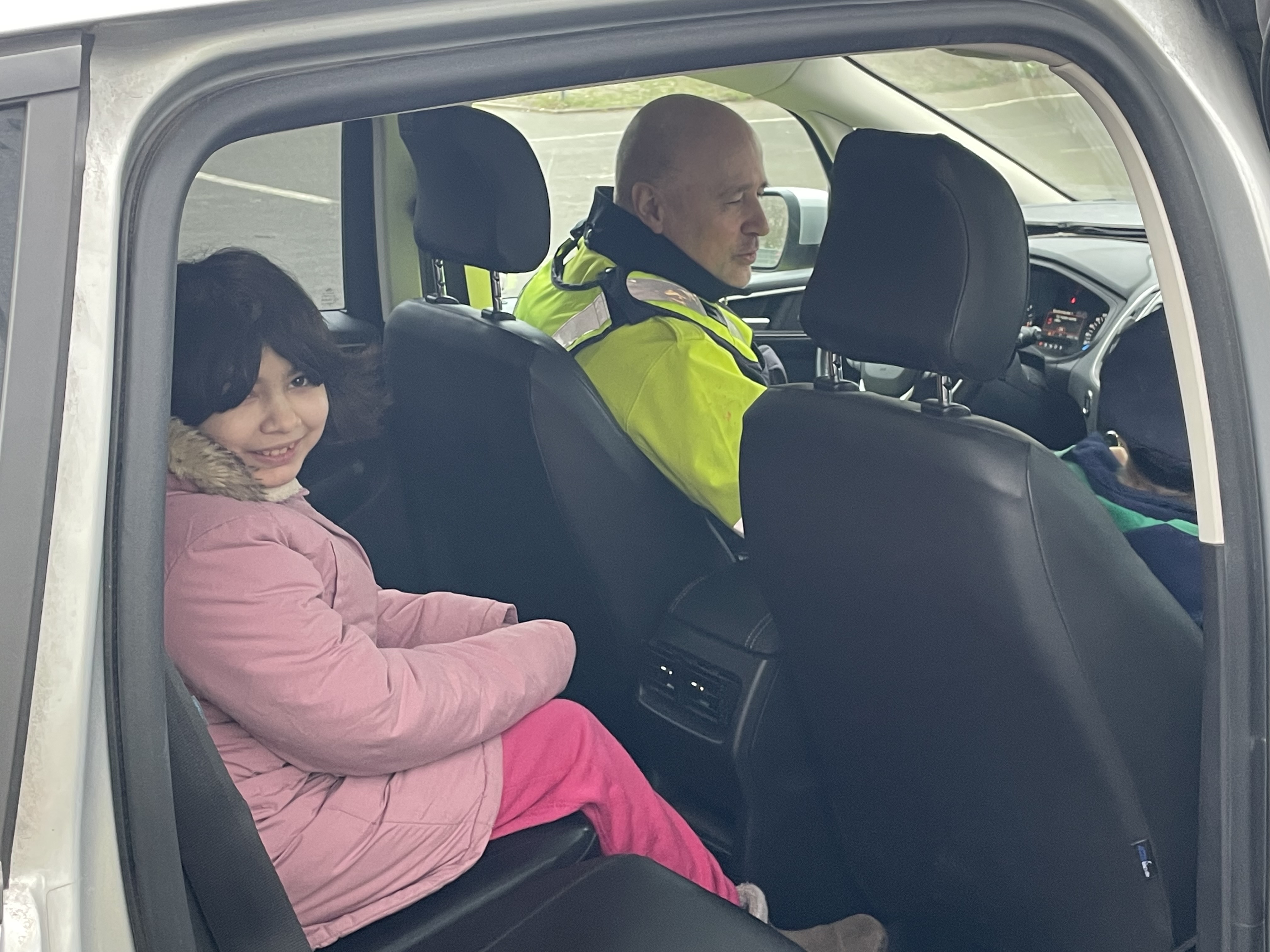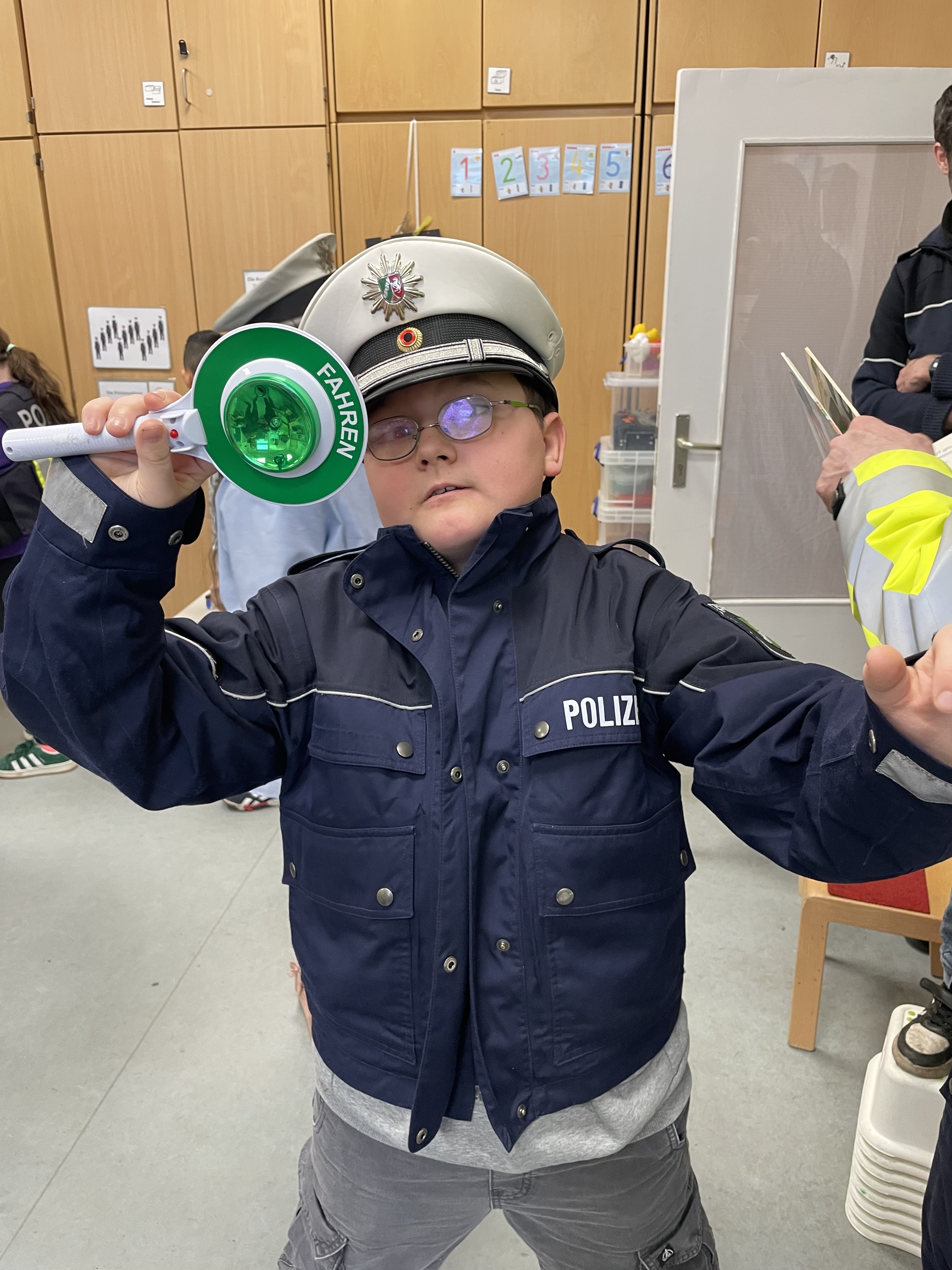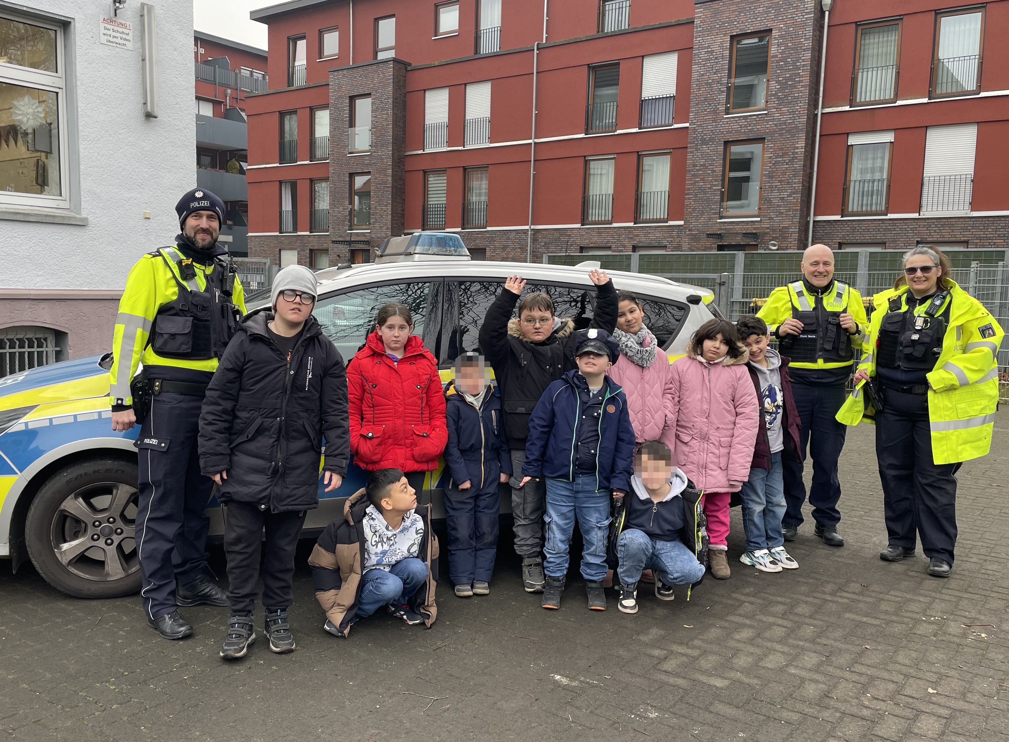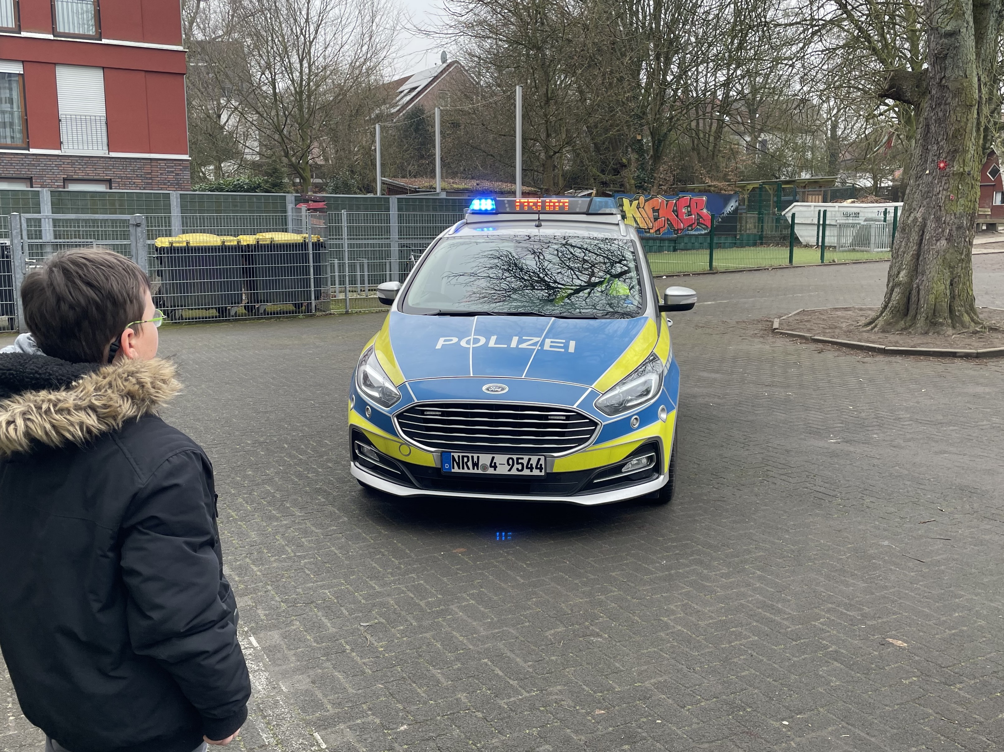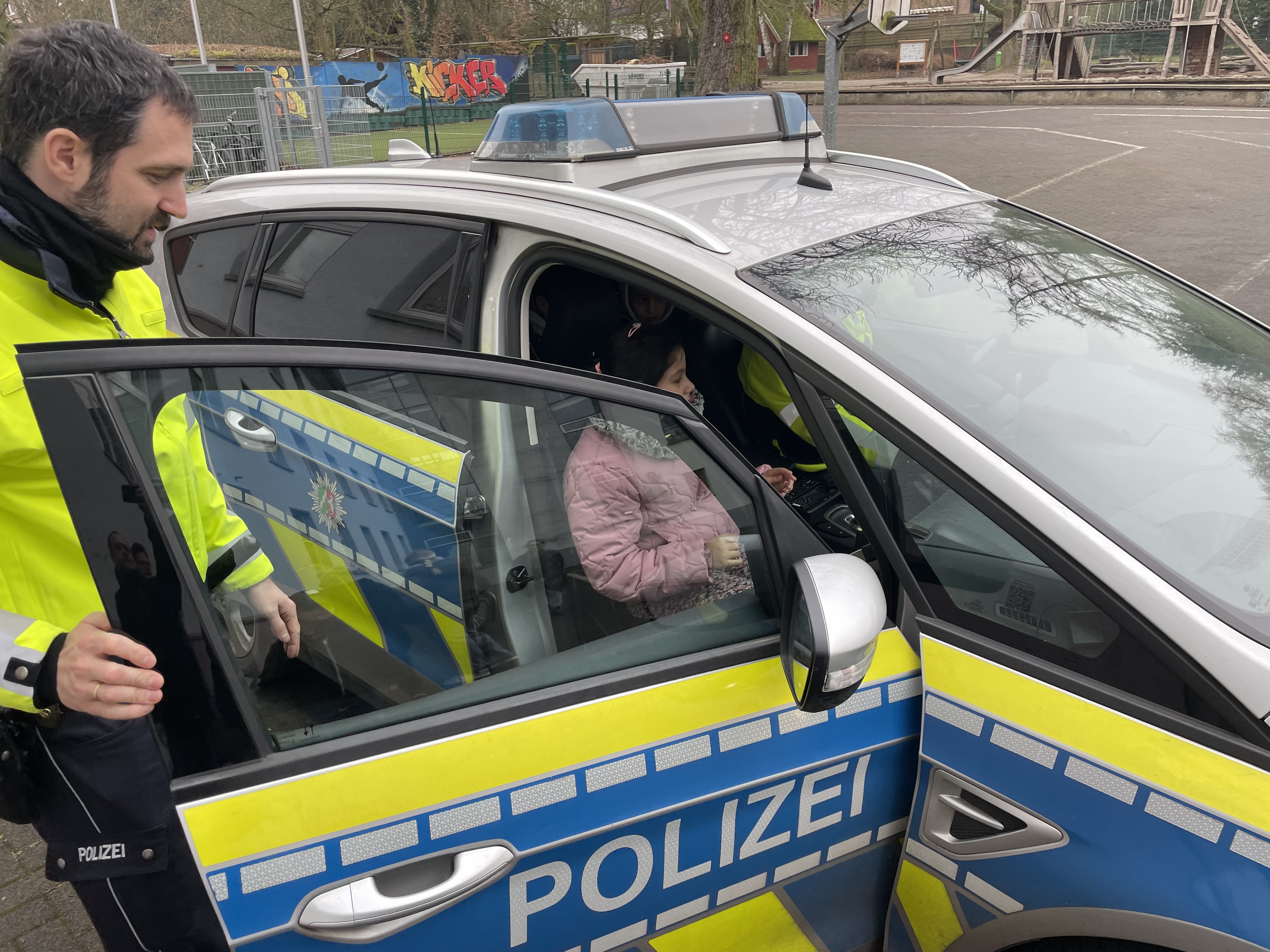 Zum Schluss durften wir alle mit dem Polizeiwagen und Blaulicht über den Schulhof fahren. Ganz schön aufregend!